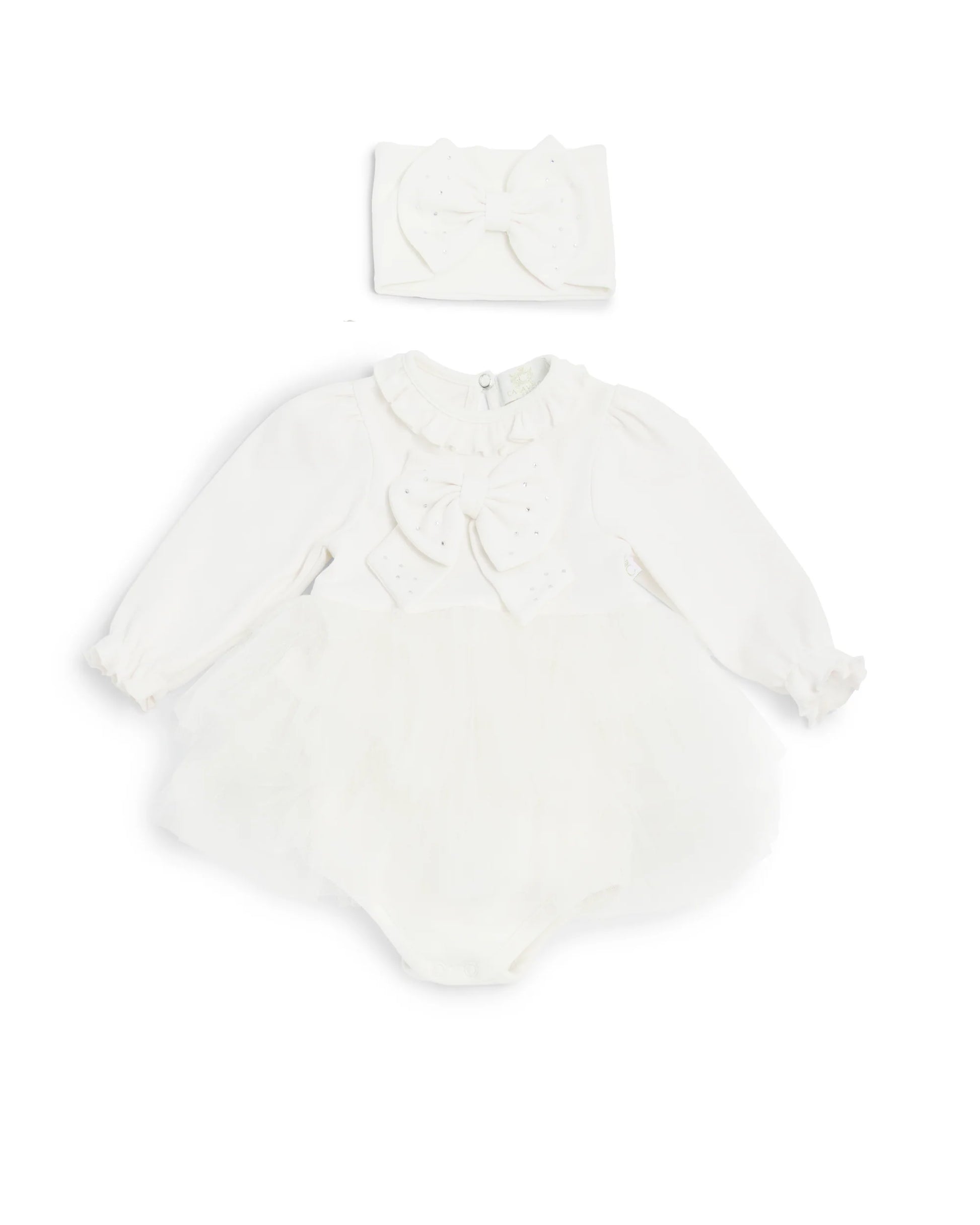 An heirloom-worthy look in timeless ivory, this twofer tulle bodysuit is full of charm. The frilly neckline, delicate bow, and soft layered skirt make it an ideal choice for christenings, special occasions, or stylish gifting. Includes matching bow headband,