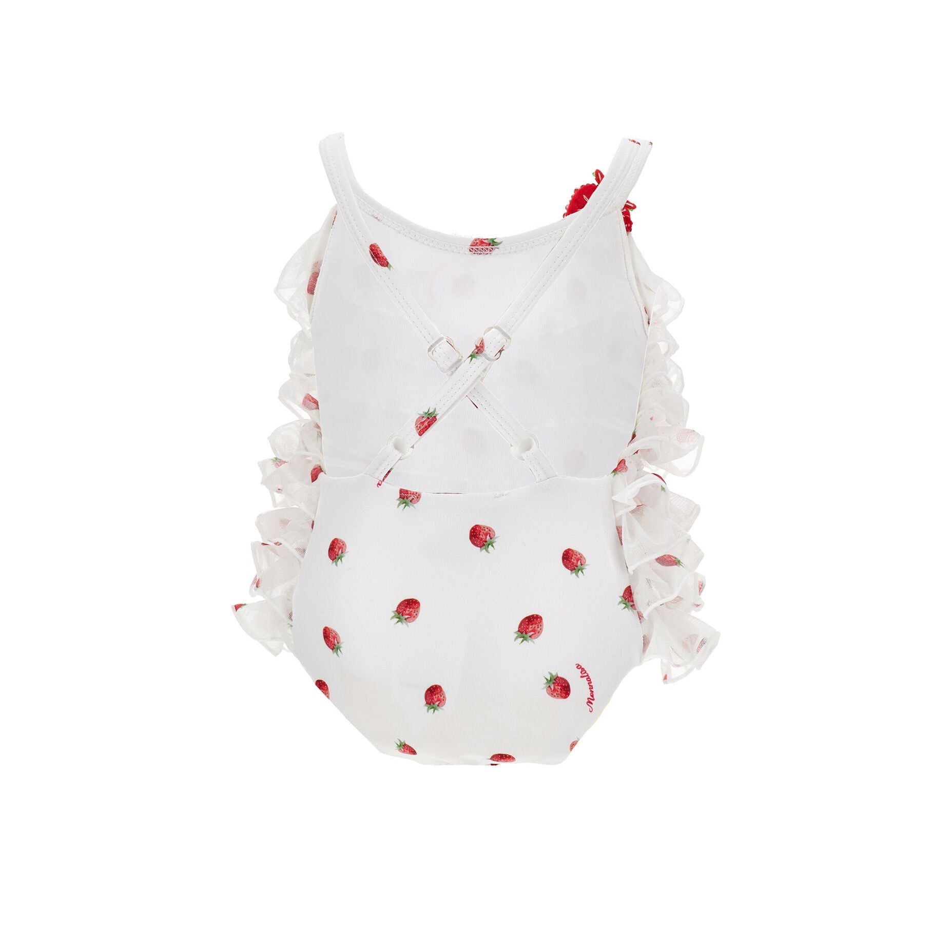 Perfect for summer days at the beach, this swimsuit is embellished with a rhinestone strawberry applique and fun ruffled details.